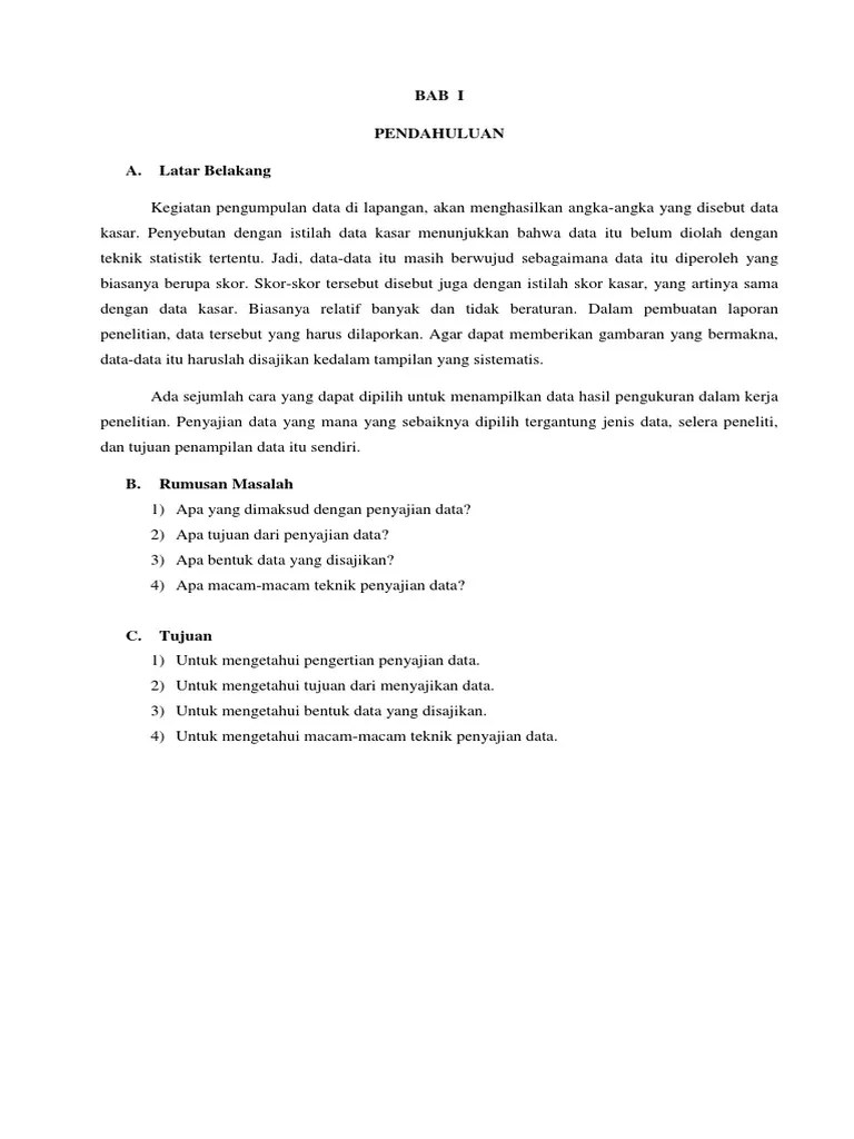 Dalam hal ini pengetahuan statistik dipakai dalam menyusun metodologi penelitian. Penyajian data hasil penelitian dengan menggunakan tabel merupakan. Menampilkan hasil penelitian dan analisis praktis dalam berbagai bentuk fungsi statistik dalam kegiatan praktis : Makalah ini berisi membahas stastistik deskriptif. Sebagai suatu ilmu, kedudukan statistika merupakan salah satu cabang dari . Tugas 1 makalah statistikadiajukan untuk memenuhi salah satu tugas mata kuliah metodologi penelitian yang diampu oleh. Salah satu kegiatan dalam pembuatan laporan hasil penelitian yang . ❖ identifikasi faktor penyebab/input untuk memformulasi . Apakah hipotesis benar atau salah serta kenapa ? Terpstra dengan median yang mempunyai kecenderungan meningkat. Dalam skripsi ini, akan dibahas uji jonckheere. Didalam makalah ini kami membahas tentang statistika, penyajian data,. Berikut adalah analisa dari statistik deskriptif dari data penelitian.